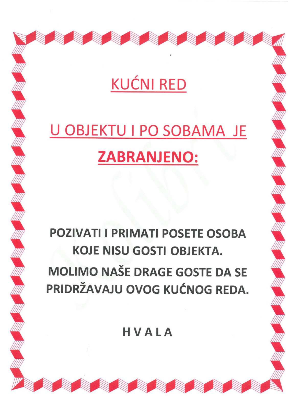 Posedujemo 16 soba. Svaka soba je opremljena CENTRALNIM GREJANjEM, klima uređajima, savremenim kupatilom sa tuš kabinom, kuhinjom sa frižiderom, kao i TV-om sa kablovskom. Terase su orjentisane ka severu (predivan pogled na kotlinu i planinu Rtanj), ka zapadu, a terase novog dela ka južnoj strani i planini Ozren.